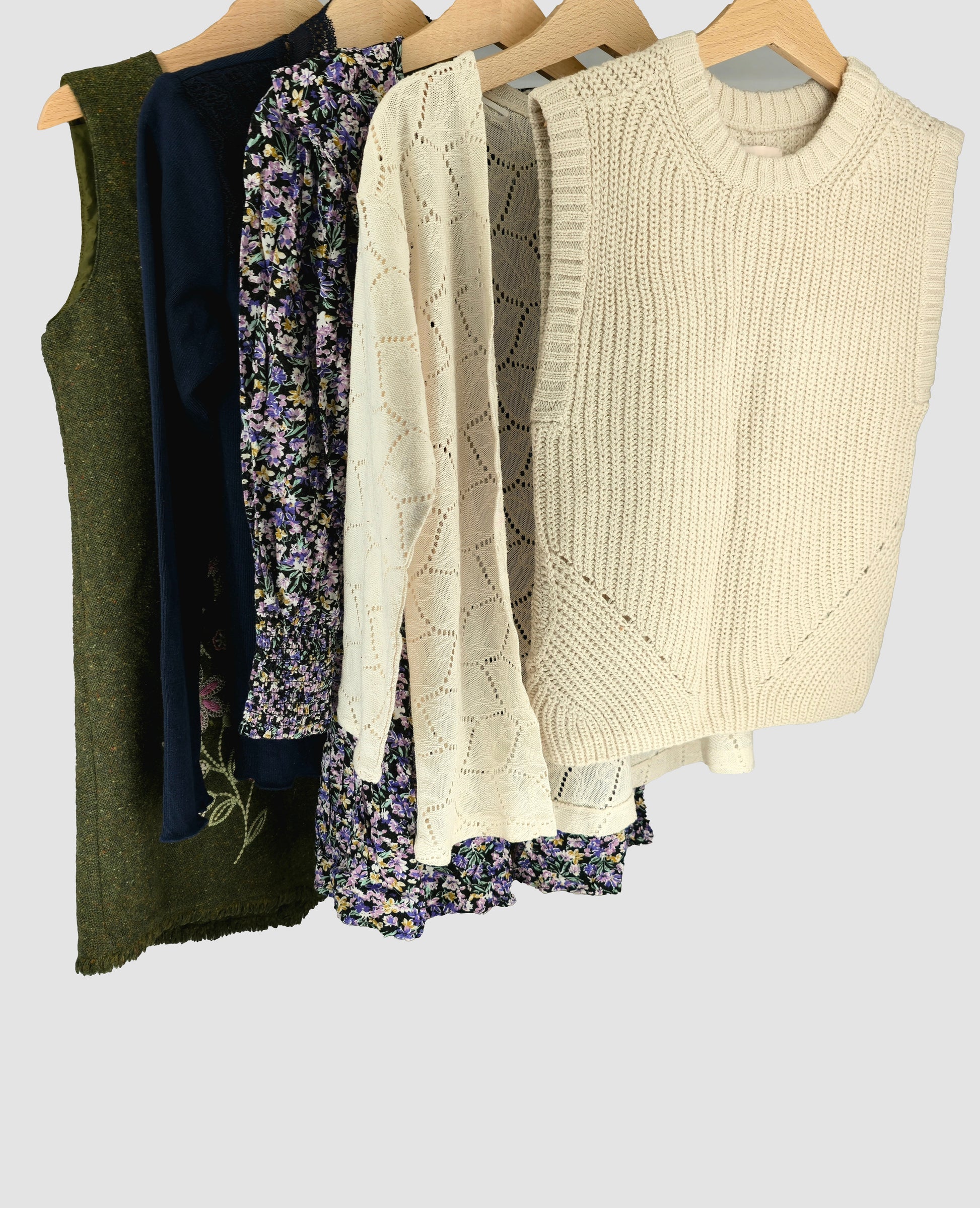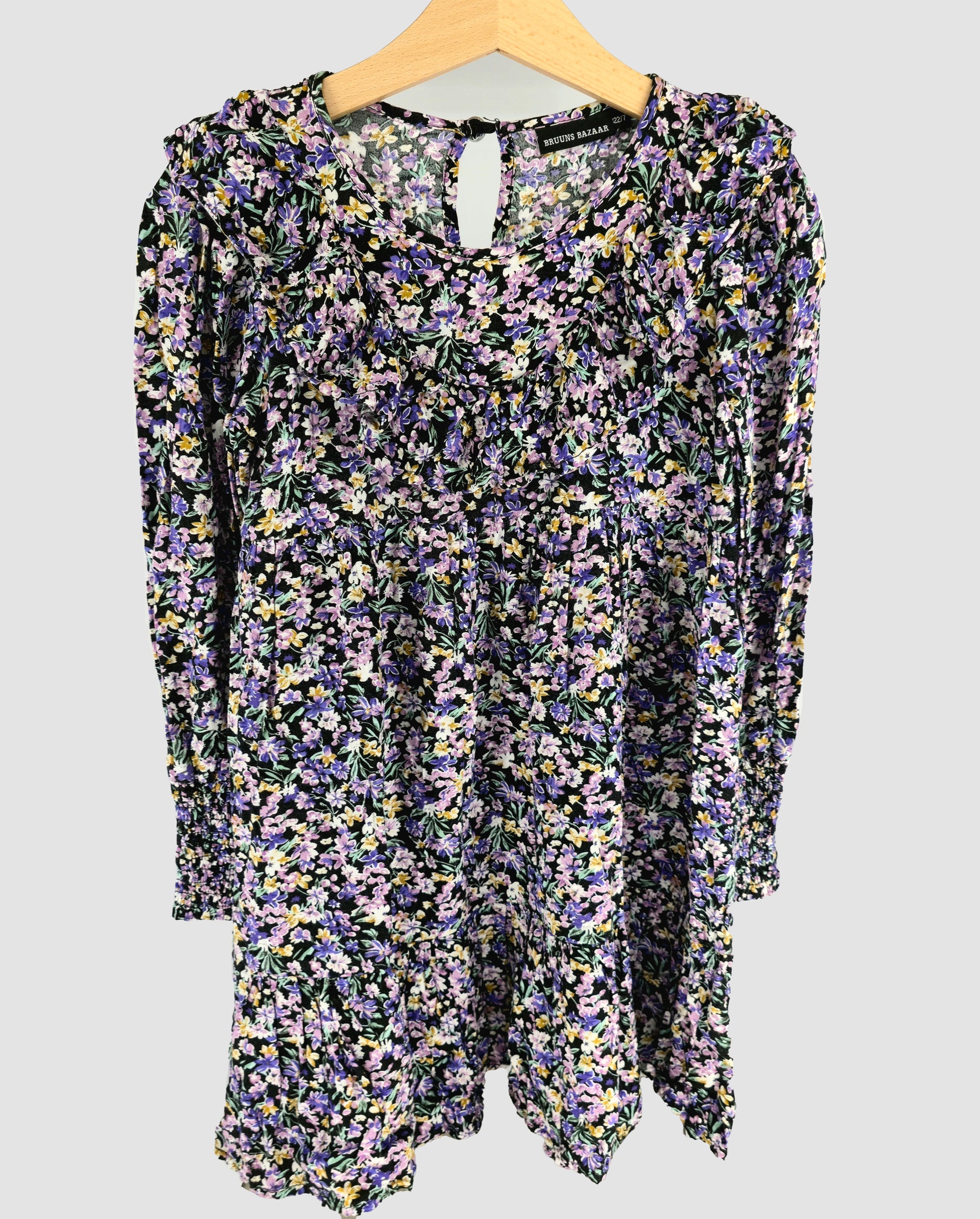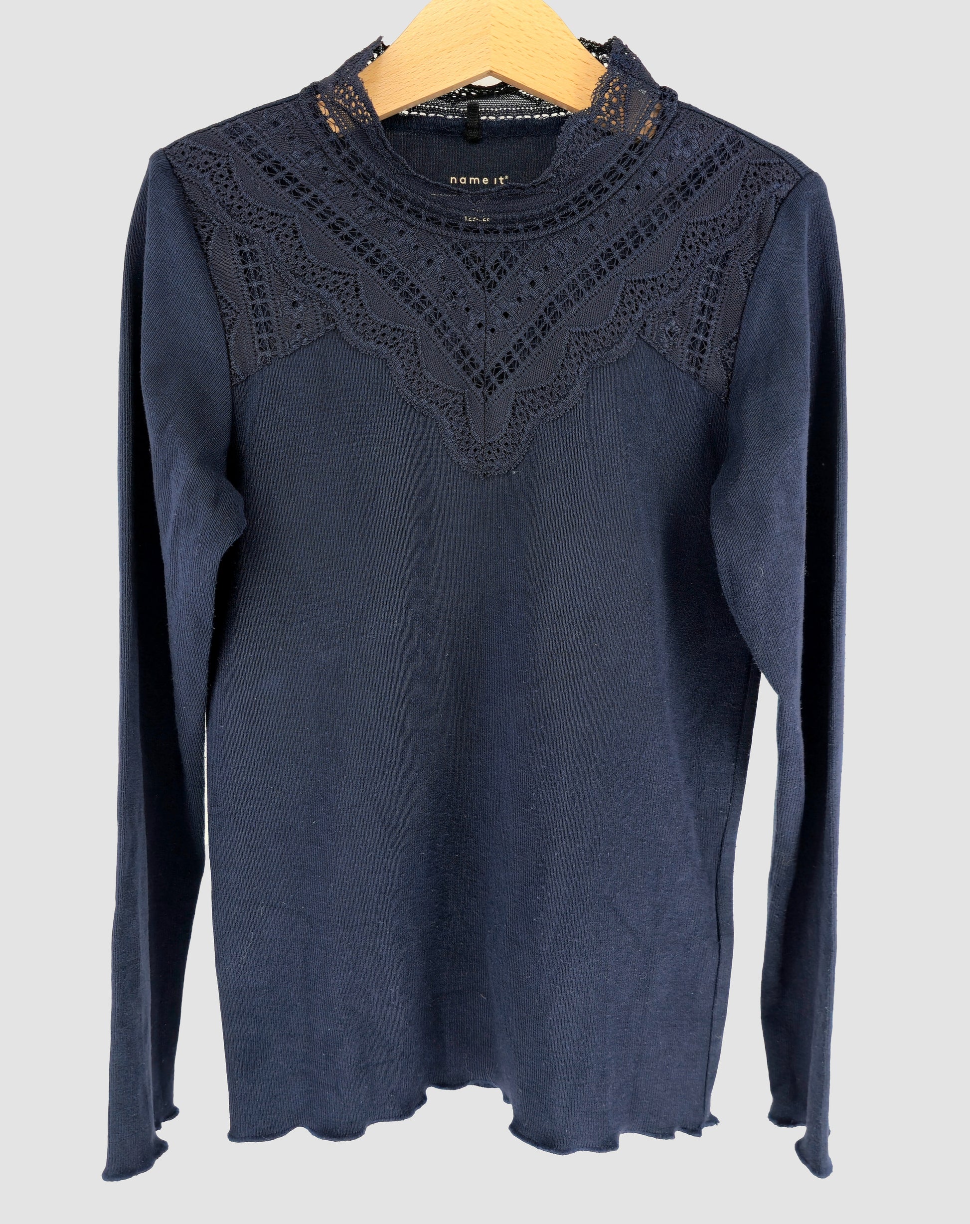 - Тъмносиня блуза с дълъг ръкав и дантела около яката