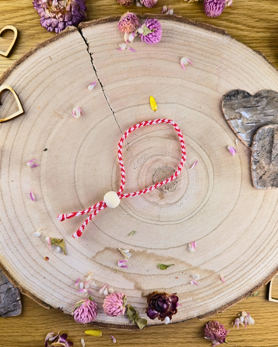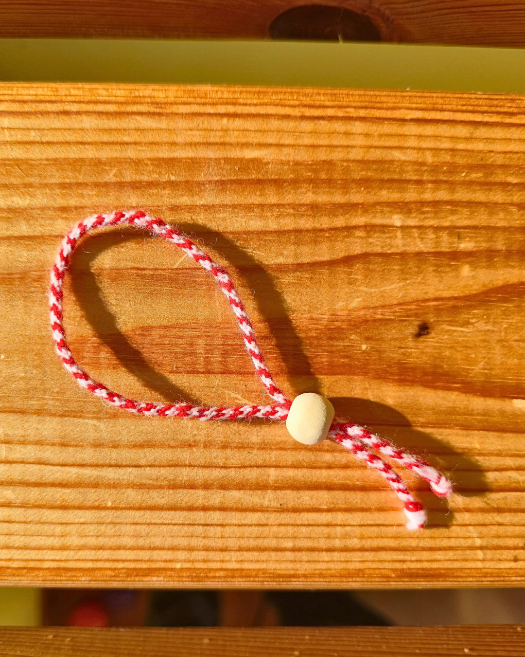 Мартеница от 100% вълнена прежда за ръка с дървено топче.