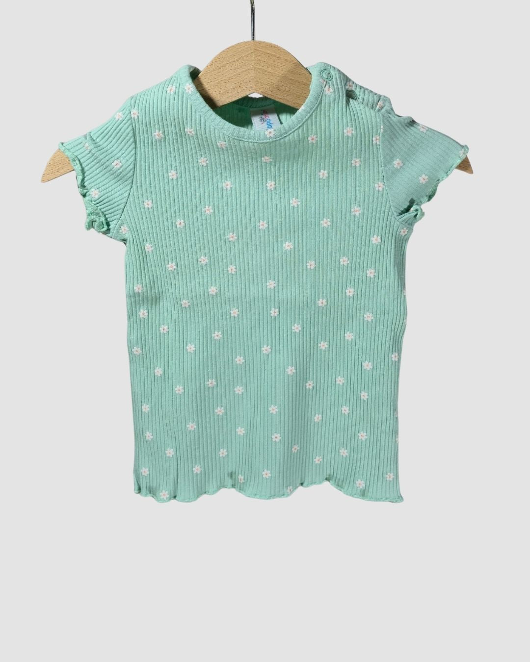 Зелена рипсена тениска с къс ръкав и принт цветя, за момиче.