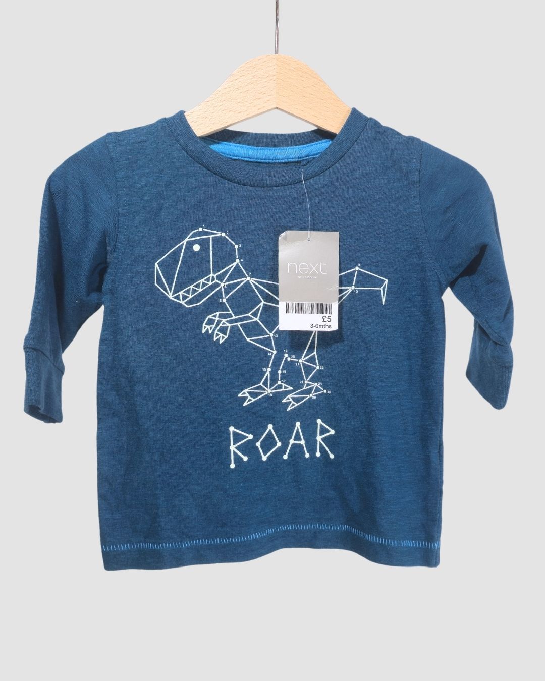 Синя тънка блуза с дълъг ръкав и принт динозавър.